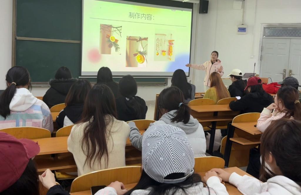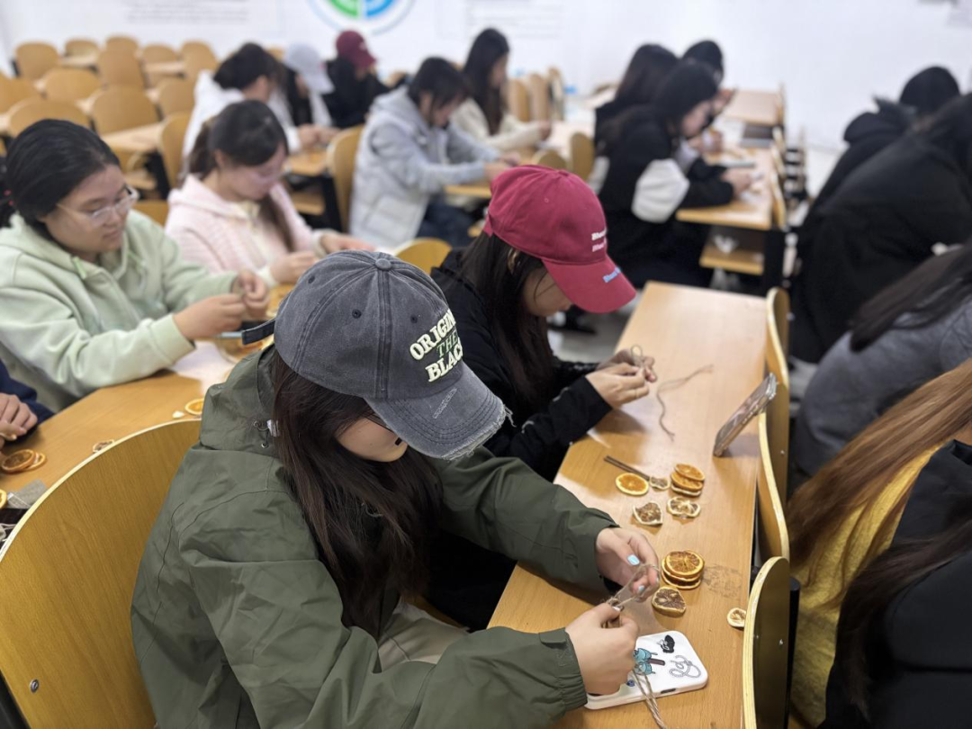 在实践环节,散发着阳光味道的干制橙片、粗糙而坚韧的麻线、形态各异的松果与散发着暖香的肉桂棒,共同构成了一组充满治愈感的创作素材。同学们在轻柔的音乐中,专注于手中的作品:将麻线一圈圈缠绕,将橙片与肉桂精心组合。这个过程不仅是制作一件装饰品,更是一次“正念”的练习——引导参与者全然投入当下,感受指尖的触感,观察材料的肌理,接纳创作中的不完美,从而与内心深处的“初心”重新连接。
