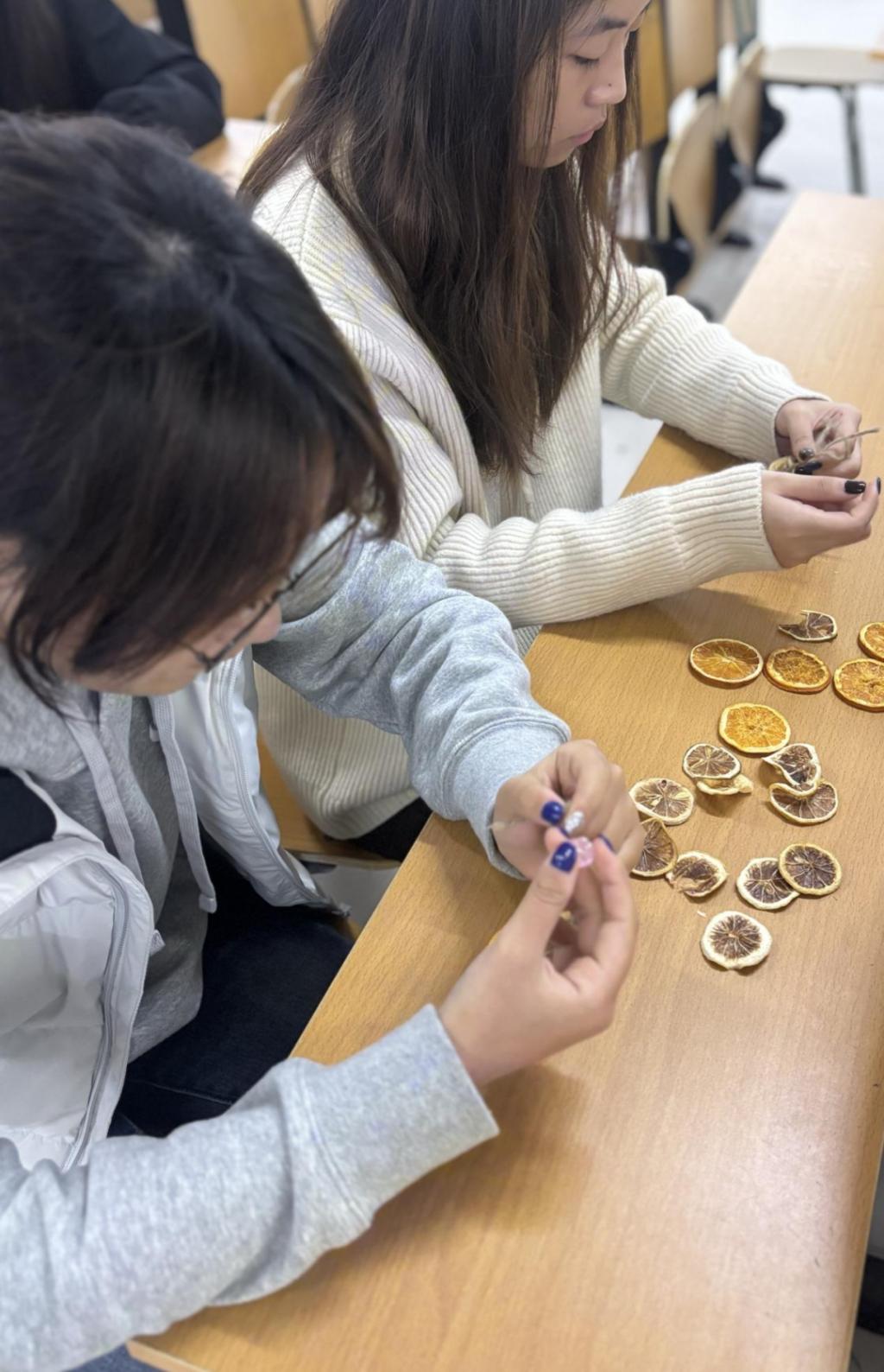 本次艺术工坊突破传统艺术的创作界限,旨在缓解当代大学生群体中普遍存在的压力与焦虑问题,选择橙片、肉桂等充满自然气息的材料,借助它们温暖的色调、独特的纹理和令人愉悦的香气,多感官地唤醒参与者内心的温暖记忆与积极情绪,从而达到情绪调节的目的。